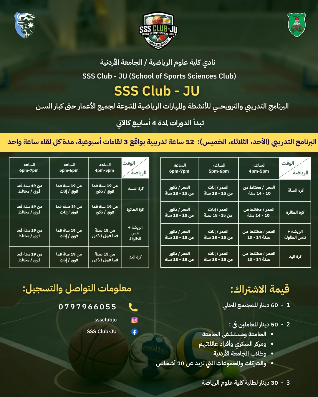 SSS Club هو وجهتك الرياضية داخل الجامعة الأردنية لمن يبحث عن تدريب جاد وتجربة متكاملة تجمع بين المهارة، اللياقة، والانضباط. نعمل على تقديم برامج نوعية تناسب مختلف الأعمار والمستويات ضمن أجواء محفزة تساعدك على التقدم بثبات.
